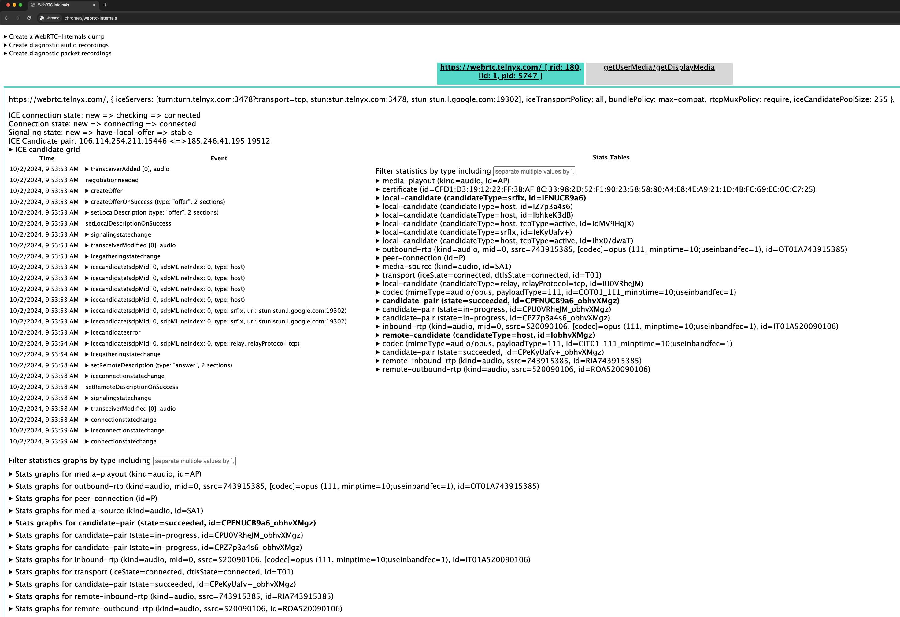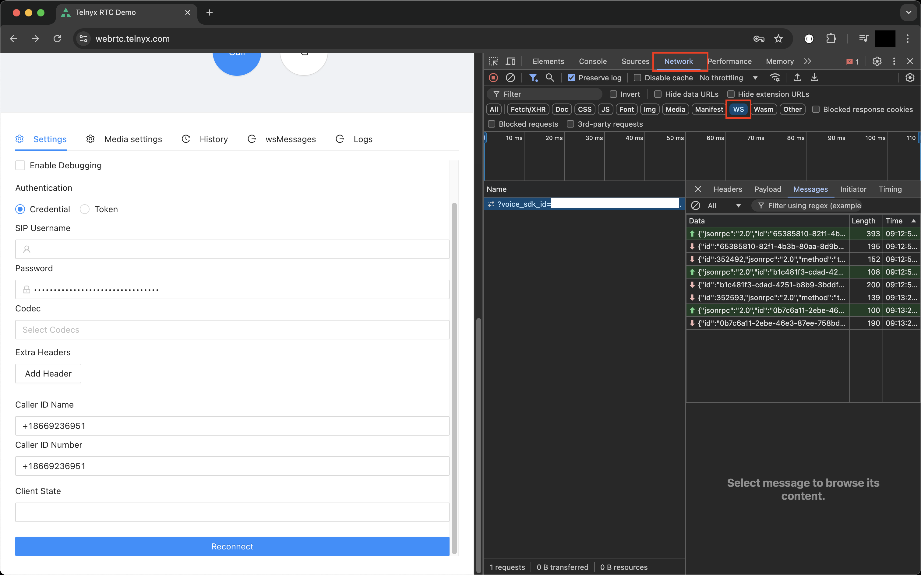 While some differences exist between the JS SDK and the mobile SDKs, they follow a similar client lifecycle and call flow. The JS SDK demo app is used here as it’s far easier to set up the application (just load up webrtc.telnyx.com) and perform debugging using browser tooling.